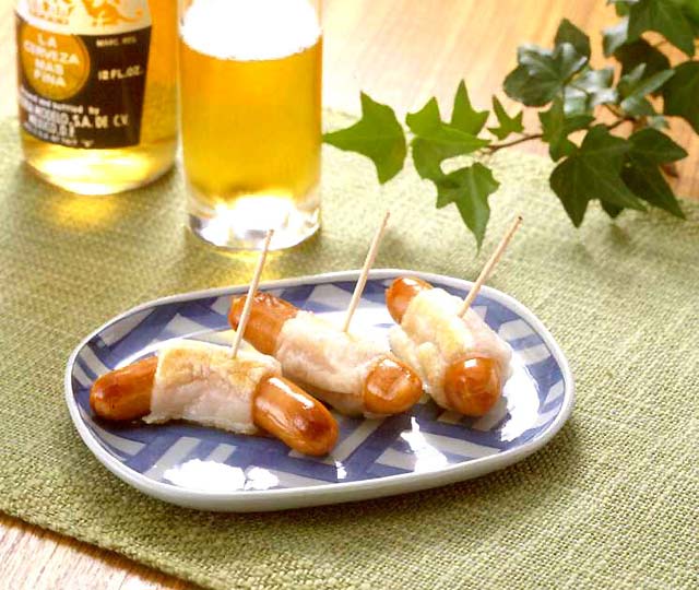 2.柔らかくなった餅でウィンナーを巻き、爪楊枝で止める。 3.熱したフライパンで餅を巻いたウィンナーを焼く。 |